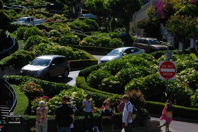旧金山一景,好好的一条路,非要搞点小小花坛,把路搞到九曲十八湾。理由是为了使繁忙的交通有所喘息而设计建造。