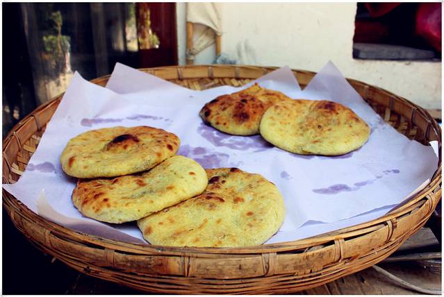 这个是卖玫瑰酒的阿婆给我们现做的玫瑰花馅儿的喜洲粑粑,真心很好吃……