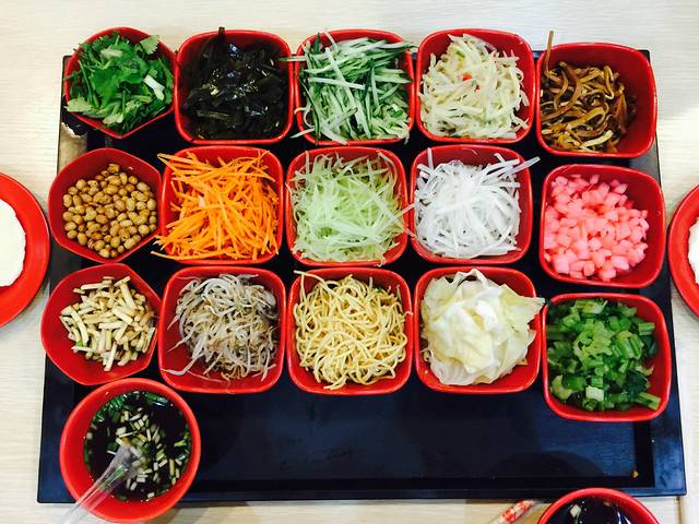 【黄姨妈丝娃娃】,按份出售,这里是两份的分量。各种小菜裹在面皮里蘸酱汁吃,一定要放多多的酱汁才好吃~~~