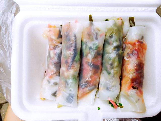 用很糯的米皮包上三种不用的酱料、蔬菜、脆脆的豆子,酱料有辣、甜、咸每样几个。一口一个舍不得吃完。