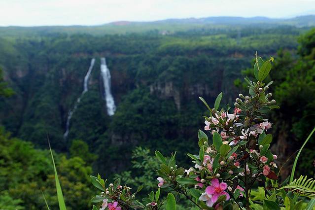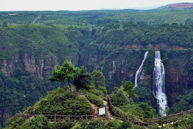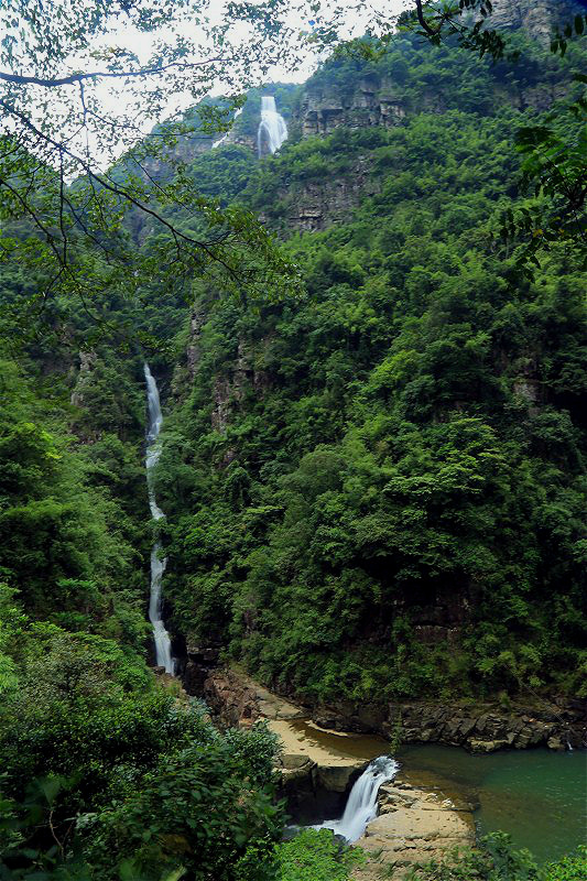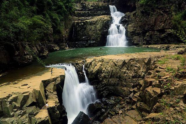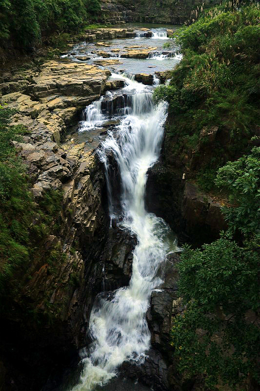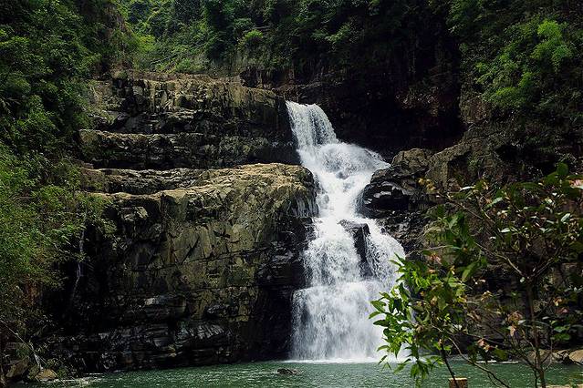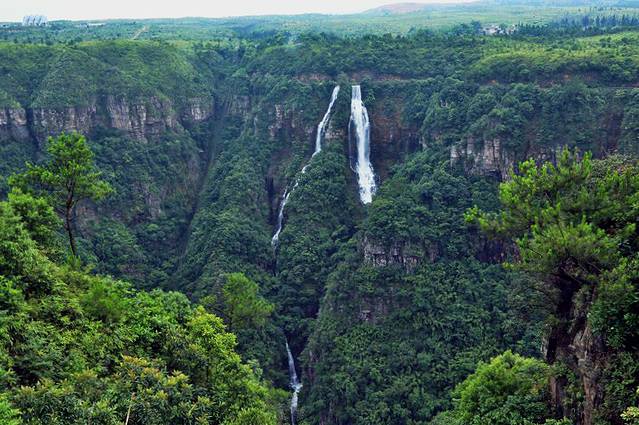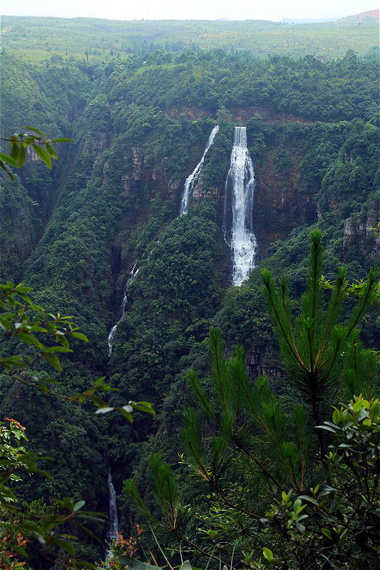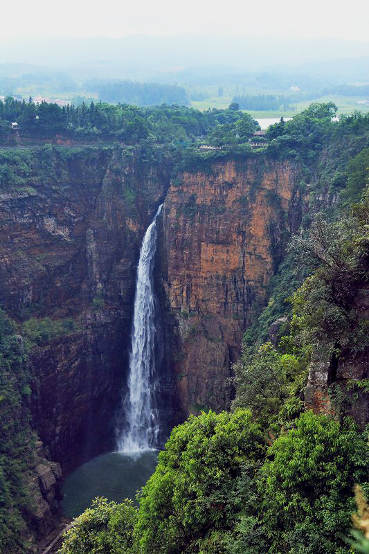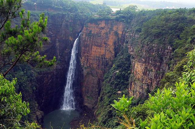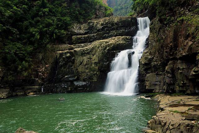 再一个就是这里的瀑布奇观。有峡谷必有瀑布,这里的瀑布不仅数量多,种类也全。有气势磅礴的帘瀑,也有奔腾咆哮的梯瀑,更有一气呵成、飞流直下的飞瀑。难得的是,还有飞帘相连、飞梯相套等瀑布奇观。形成这种瀑布大观的原因主要就是它的这种突兀性地陷式构造特点,包括当地大布河在内的大小水流如同万马奔腾从四面八方而来,到了这个大窟窿全都一泻而下,这就形成了大峡谷处处飞瀑,到处挂帘的壮观景象。可惜的是,我们这次来刚刚错过他水量最充沛季节,没能看到谷中水汽腾腾的景观。好在我们还是欣赏到了包括像个酒坛口的埕头大瀑布在内的不少瀑布,以及与这些瀑布相连的众多水潭。