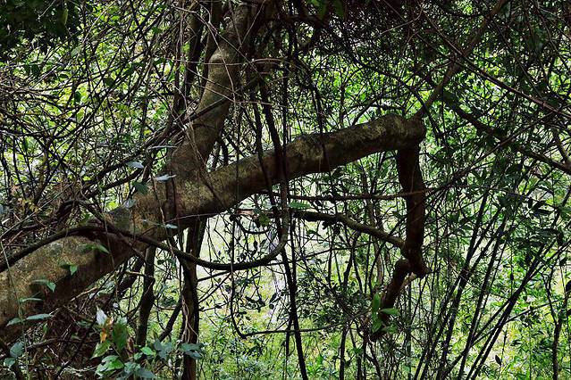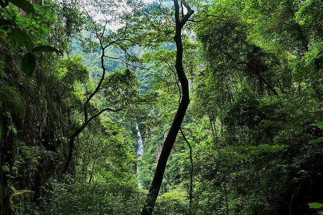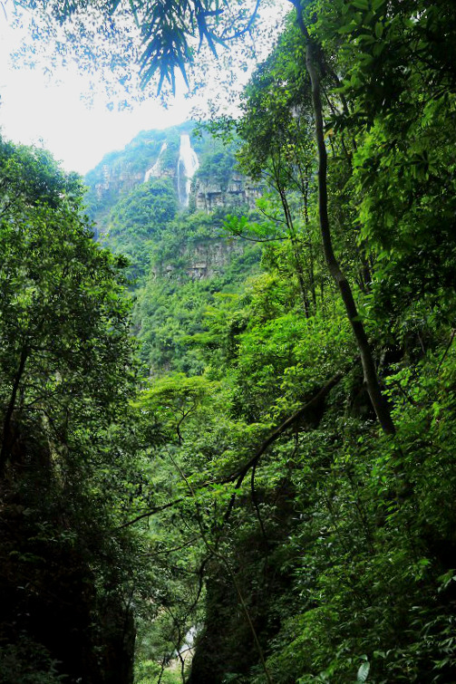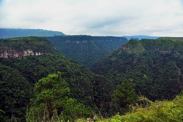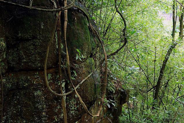 另一个是这里的地貌特点与同属于岭南的丹霞山地貌非常相似,不过这里是以石灰岩为主。大峡谷除了峡谷顶部露出一部分赤壁丹崖,绝大部分都覆盖着茂密翠绿的森林植被,使大峡谷显得郁郁葱葱,生机勃勃。这与这里的湿润气候和充沛水汽不无关系,给植物生长提供了充足条件,走进大峡谷就好像进到了一个绿色王国,据说这里的各种植物有多达二千多种,只是大多数我们都不认识。我们穿行在树林灌木中修出来的栈道,闻着四处野花杂草散发着的那种原始清香,不知不觉就走完了四个多小时的行程。