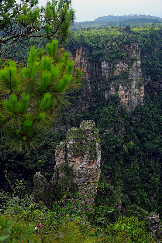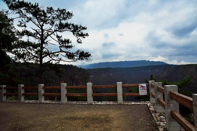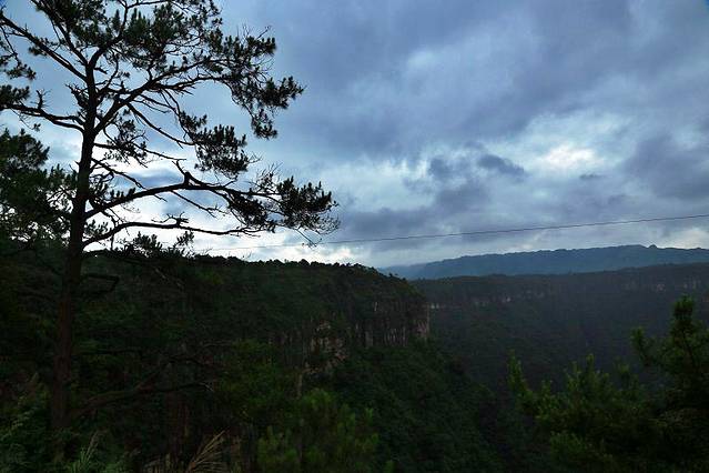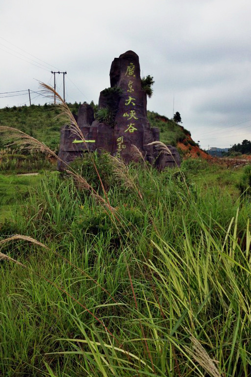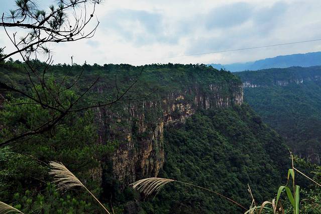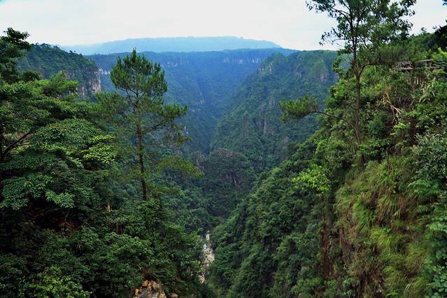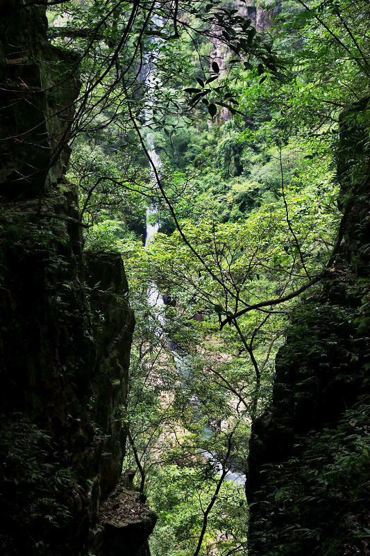 一个是虽然它也属于地缝地陷式大峡谷,但构造上给人感觉比较突兀。我们从乳源县城一路翻山越岭过来,到了大布镇后眼前是一片开阔,只有远处的黛山还提醒我们是身在山区的盆地。一路平缓地走到景区,忽然就发现我们已经站在悬崖峭壁之上,面前是大地突然间裂开的一条大地缝,又或者是炸开的一个大窟窿,那份惊奇真是难以言状。整个峡谷看上去气势恢宏,谷面窄处不过百米,宽处超过千米。站在断崖绝壁的谷口俯视三百米以下的谷底,真让我一时感觉目眩,更感到大自然的魄力。