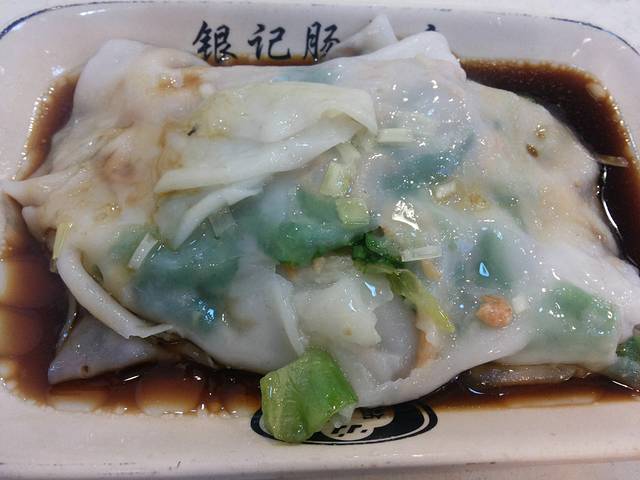 没有起特别早,旅游嘛,节奏没必要这么快。吃早茶!还是在客村,丽影广场出门的左手方向,走一小段惊现银记肠粉店,必须得去啊,因为还要去吃点心就一人只是点了一份肠粉,虾仁肠粉,玉米肠粉