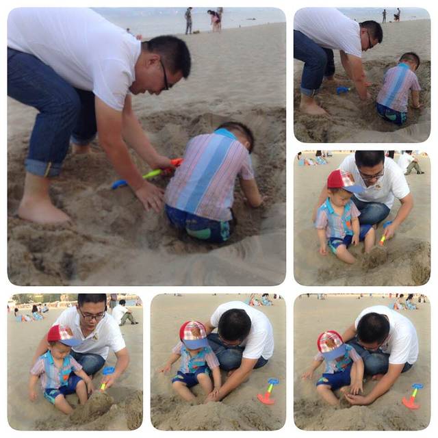 明媚的 阳光、松软的海滩、干净的海水、纯净的空气,在这个美丽的岛城上,父子两就在沙滩上开心的寻找埋在沙滩下的“宝藏”。