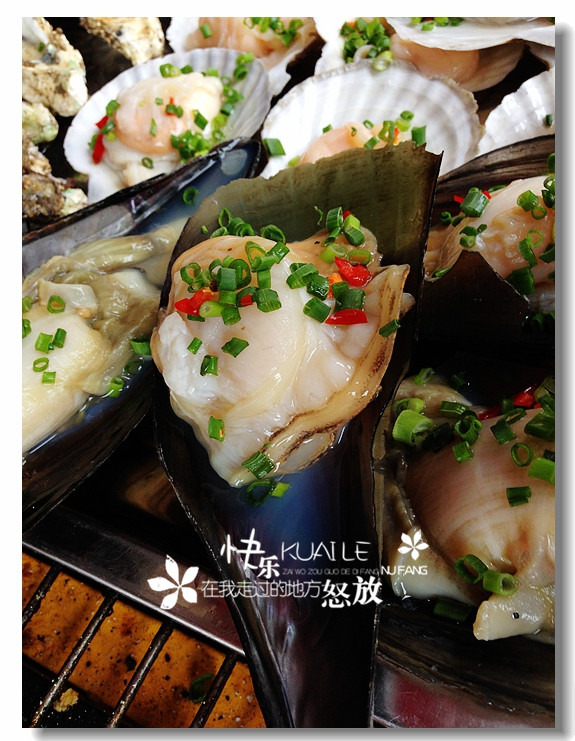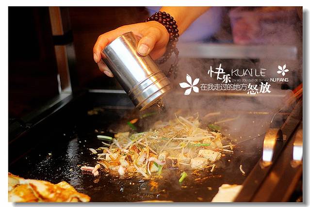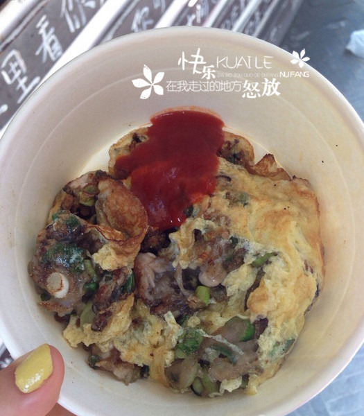 海蛎煎:把蛋,海里,面粉,地瓜粉等放在大锅上炒,撒上大把大把的大葱,配上老板自己调制的番茄酱,一盘美味的海蛎煎就出炉了。
