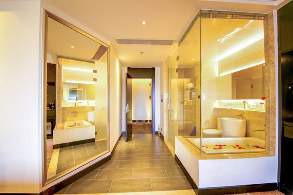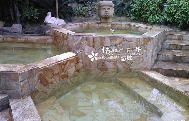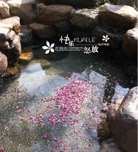 温泉里还铺上了花花草草,具体是什么花瓣就不知道了,像电视剧里的感觉。