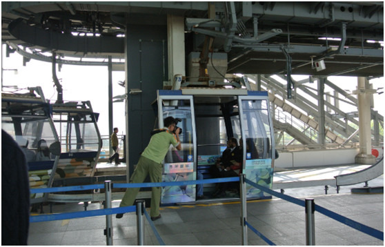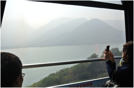 这可是全亞洲最长的双缆索缆车系统哦!车厢在运行的全程都很稳,在360度观景的车厢里可以看到东涌、大屿山北部和南中国海的景色。一个车厢可以坐最多10个人,但是我看一般最多六七个,遇上人少的时候还可以独自一个车厢呢!在车厢里看向外面,好像一幅不断游走的画。
