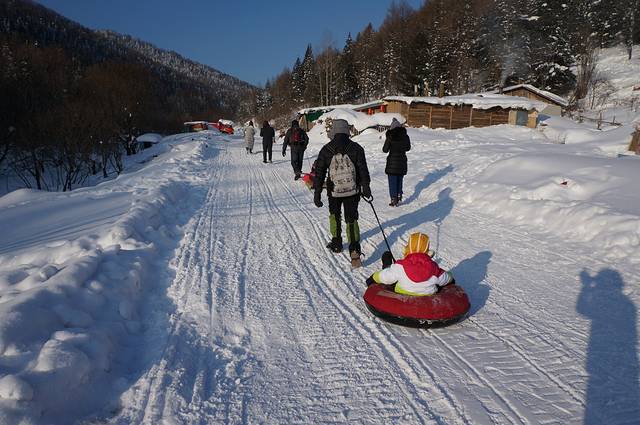 路上租了一个雪圏一个雪橇准备找些小坡道自己滑雪。