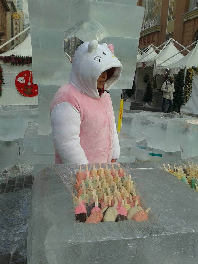 冰雪展已经快要开始了,市区到处都在堆冰块,准备进行冰雕,中央大街上有的冰雕已经做好。寒冷的地方一大特色是吃冰,可能就像重庆四川大夏天吃火锅一样吧