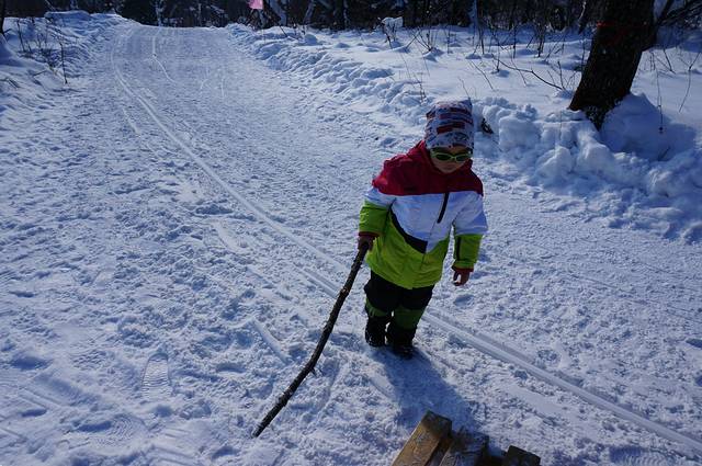 看,这里雪厚,有点坡道,人少,就在这里吧,这是我们找的第一个地点,还是雪圏好滑,雪橇就当了行驶工具。