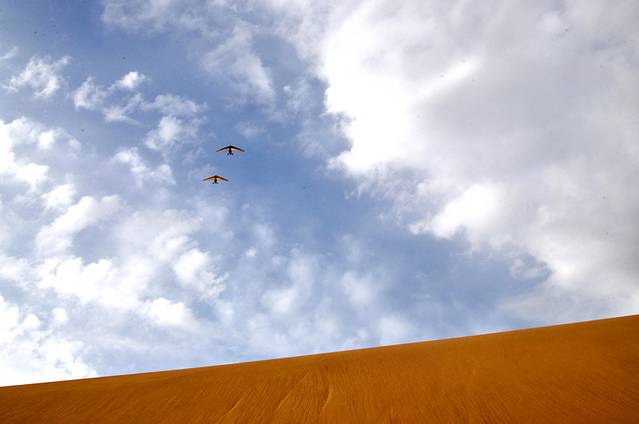 第三张:鸣沙山上的滑翔机,蓝天、沙漠中的滑翔机,是否可以真的飞起来,反正感觉很酷,可是没有胆量去尝试一下。