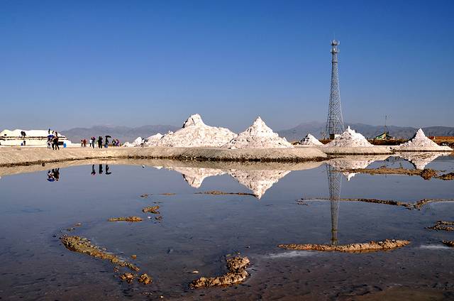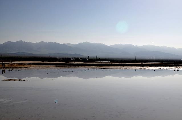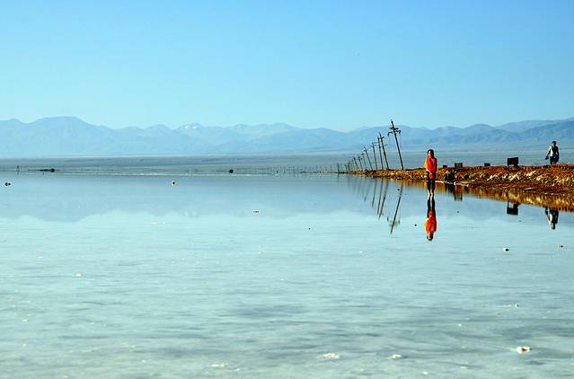 茶卡盐湖也叫茶卡或达布逊淖尔,“茶卡”是藏语,意即盐池,也就是青盐的海。茶卡盐湖是柴达木盆地四大盐湖中最小的一个,也是开发最早的一个,已有3000多年的开采史。茶卡盐湖是固液并存的卤水湖,镶嵌在雪山草地间而非戈壁沙漠上。盐湖水域宽广,银波粼粼。天空白云悠悠,远处苍山峥嵘,蓝天白云、雪山映入湖中,如诗如画。四周牧草如茵,羊群似珍珠洒落。漫步湖上,犹如进入盐的世界。