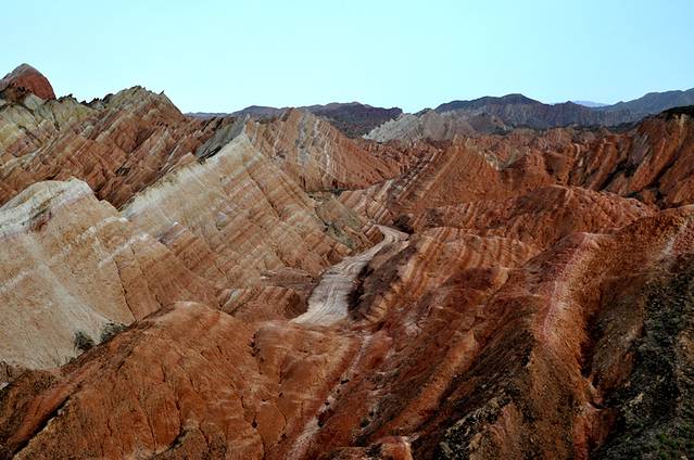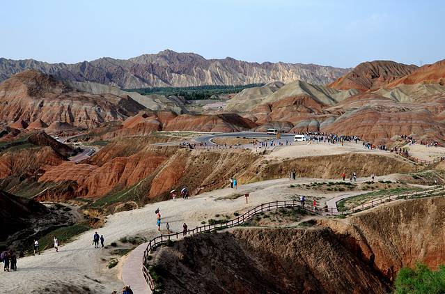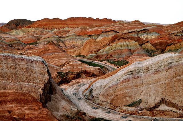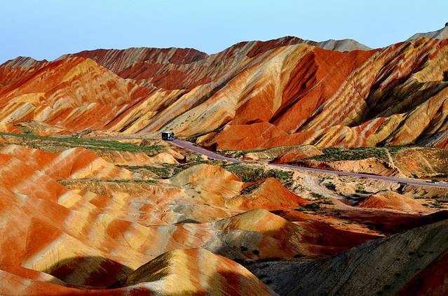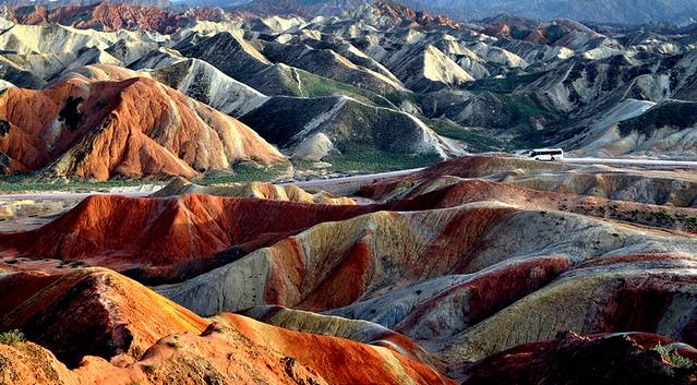 第七张:张掖丹霞国家地质公园,七彩山,颜色的跳跃让你眼中全是色彩,路上的汽车成为唯一的焦点和亮点。