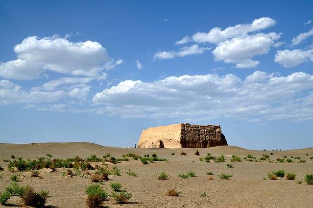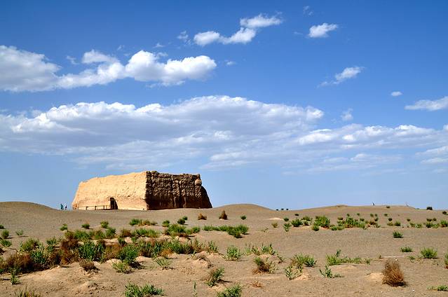 大漠、古堡、蓝天、白云,点点滴滴的大漠上的绿植,是不是每粒砂砾都能诉说出在这里发生的几千年前的故事