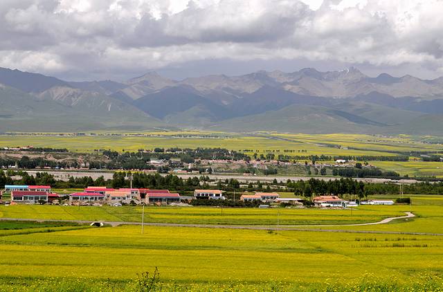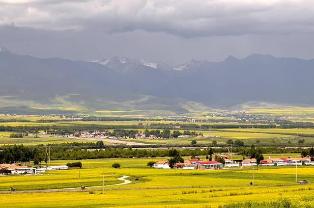 典型的门源景色,金色的油菜花、红色的农舍、青色的祁连山、白色的云、蓝色的天空……