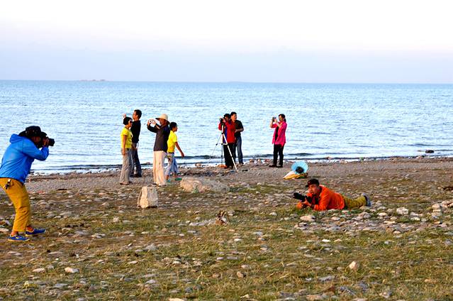 既然住在了湖边,日出也不得不看了,虽然一路都在希望着看日出,但是因为懒惰都没有成行,这住在湖边,掀开帘子就能看到日出的环境,再不看日出就真的说不过去了,因此看了此次唯一一次的日出,青海湖日出。别说看了很多大漠日出,大湖的日出还真是第一次,虽然很冷,但是湖边还是围了很多人,费了好大劲才给相机找到一个空白方向。
