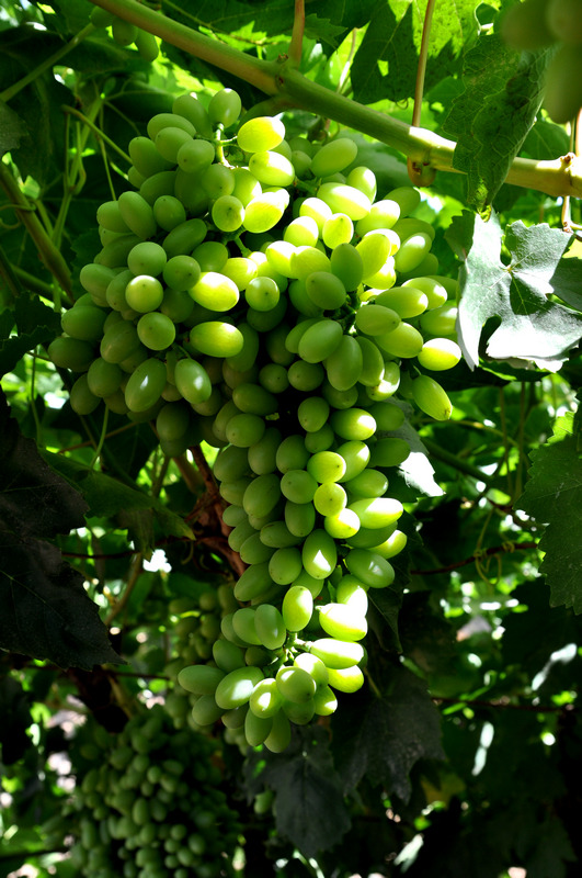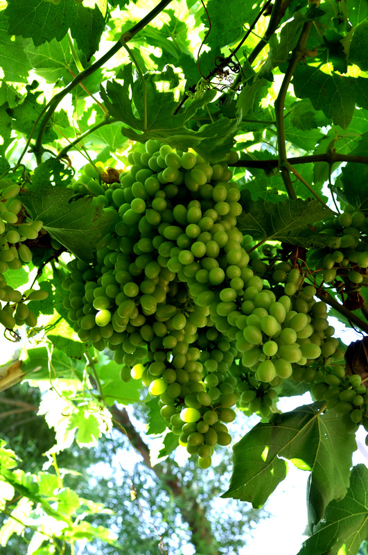 玉门关出来、途径沙漠第一村,这是离城市最近的沙漠中的绿洲,据说这个村子很富,因为有水,有泉眼。路边的葡萄还没熟,据说在敦煌路边的葡萄大家可以随意吃,你吃的越多,主人越高兴,说明他们家的葡萄最好吃。可惜啊,还是绿的,但是也难不倒我们钻到葡萄架下,看看这绿色的珍珠…