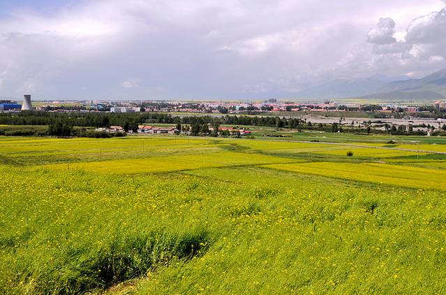 第八张:门源油菜花,金色的油菜花、红色的村舍、青色的祁连山、山顶的积雪、风雨欲来乌云,构成多个层次。