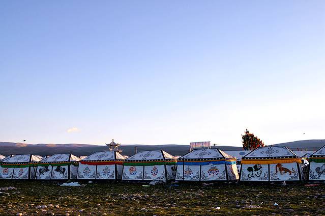 这是被一个老板包下来的地方,从村子里拉来了电,旁边有厨房和餐厅,虽然菜做的很难吃,但是价格还好。厕所也是移动的,开车拉着简易厕所。我们帐篷后面支起了两口大锅,不停的烧着开水,供大家使用,条件也算不错。旁边堆砌了篝火,晚饭后,藏族的小伙子们拉着大家跳起了缸锅舞。兴奋后的游客开始进入梦想。当然,住宅区内放出的两条狗,让我一直没怎么睡着。