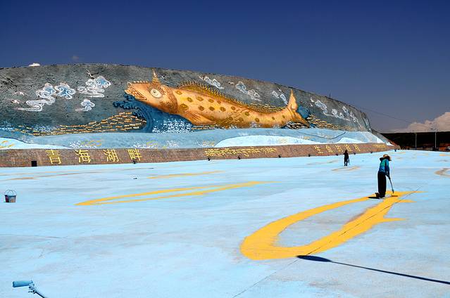 广场上的彩绘,“青海湖畔,生命的旅程”。