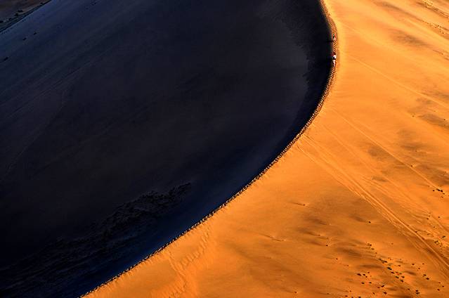 第六张:沙漠,绝对的沙漠,沙漠的曲线,沙漠的色彩,沙漠的纹理,以及沙漠中行走的人影。