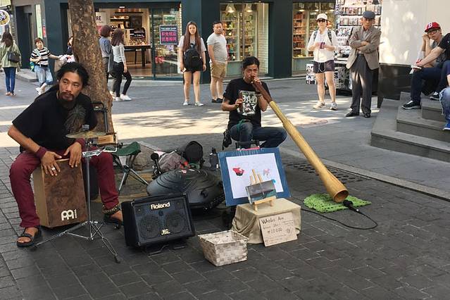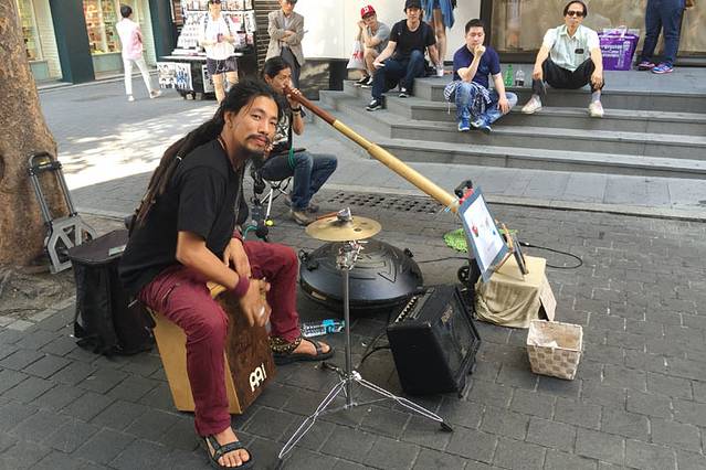 不知道那个长长的是什么乐器,他们吹出和拍打出来的音乐真的很好听,越来越多的人围过来听。