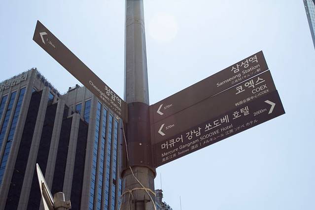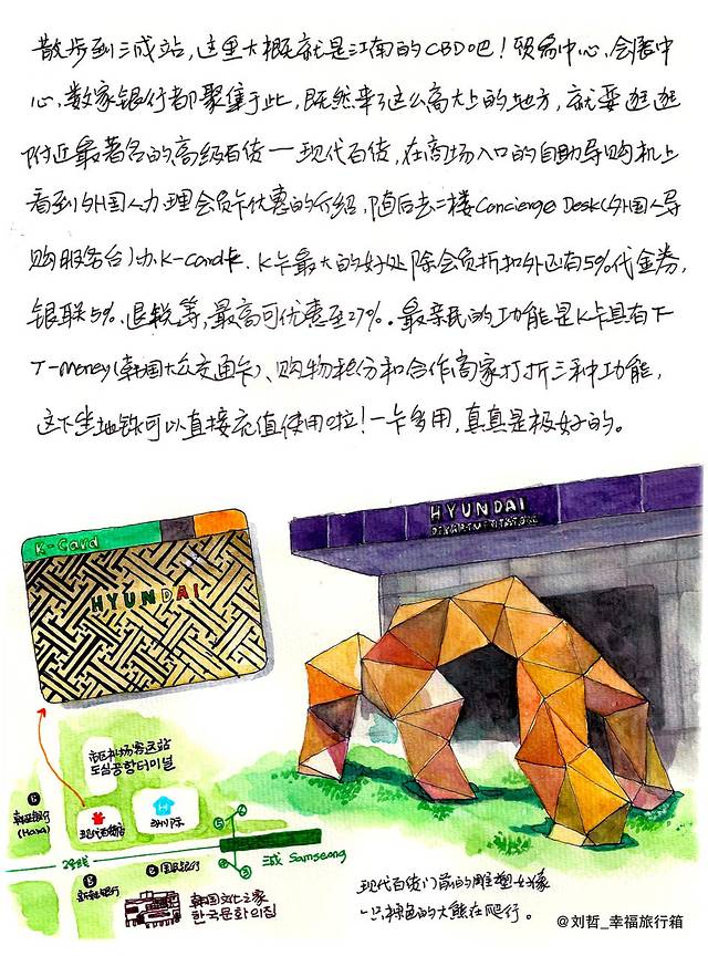 散步到三成站,这里大概就是江南的CBD吧!贸易中心、会展中心、数家银行都聚集于此,既然来了这么高大上的地方,就要逛逛附近最著名的高级百货商场——现代百货,在商场入门的自助导航机上看到外国人办理会员卡优惠的介绍,随后去二楼Concierge Desk(外国人导购服务台)办K-card卡,K卡最大的好处除有会员折扣外还有5%代金券、银联5%、退税等算下来最高可优惠27%。最亲民的功能是K卡具有T-Money(韩国大众交通卡)、购物积分和合作商家打折三种功能,这下坐地铁可以直接充值使用啦!一卡多用,真真是极好的!
