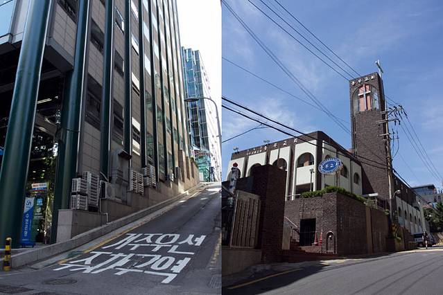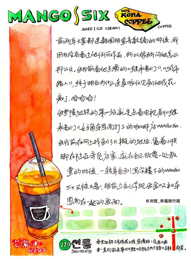 出宣陵地铁的第一站就先去看电视剧《继承者们》女主角车恩尚打工的咖啡店MANGO.SIX,出发前在网上找到了大概的地址,凭着小快脚在附近寻觅店家,就在自己欣赏一处教堂的时候,一转身看到对面写字楼下的MANGO.SIX又惊又喜,眼前立刻浮现出金叹和车恩尚在一起的画面。