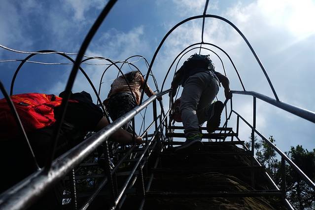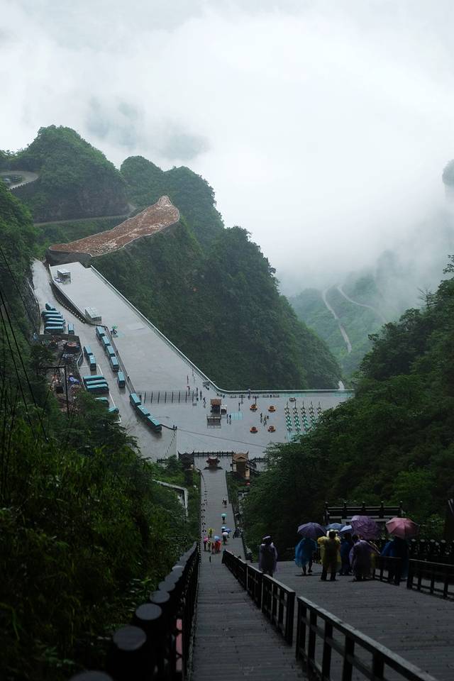 这段上天梯是999级登天祈福之路,晴天一定要爬一爬,我站在上面往下看看,腿都软了。因为下雨,我们就不从这里爬下去了。旁边有从隧道里面继续向下的穿山电梯,但这一段不在门票包含之内,需要自费。