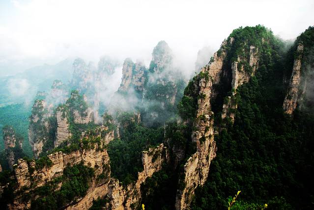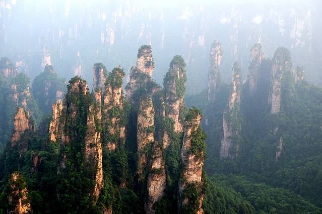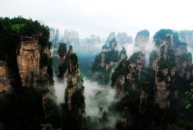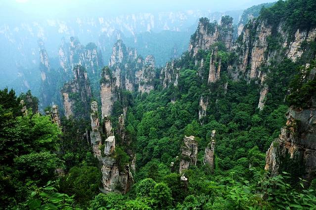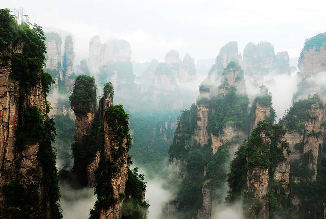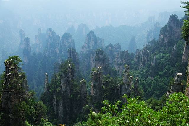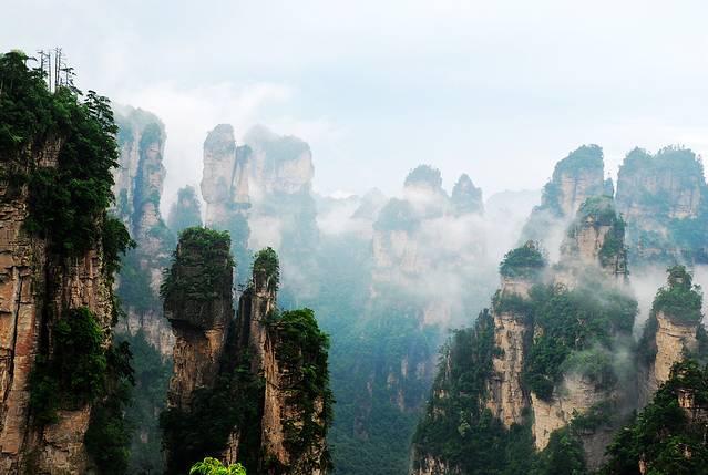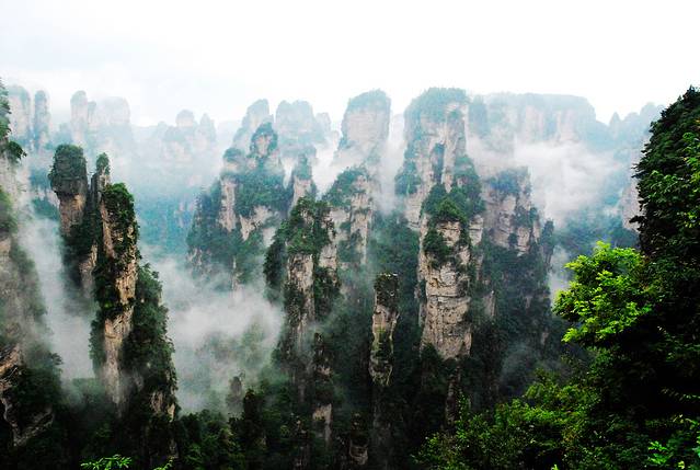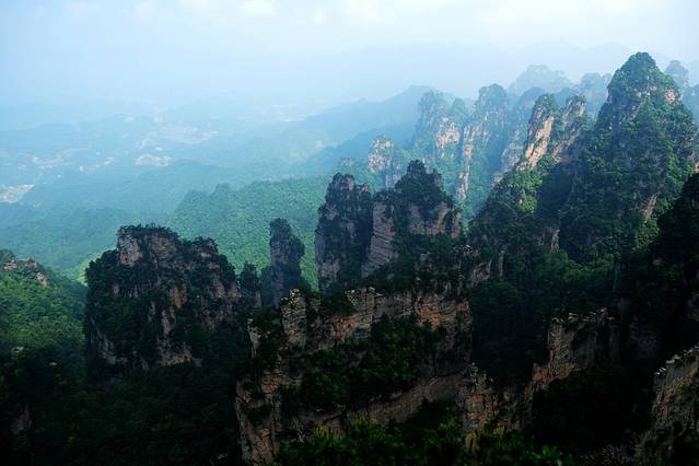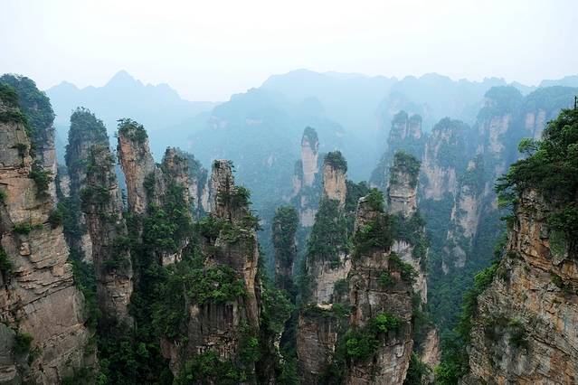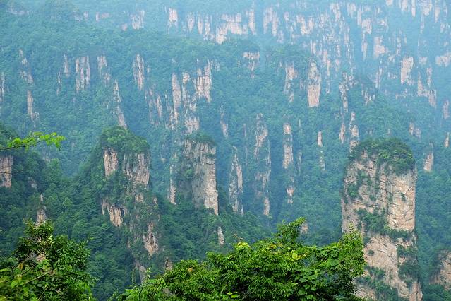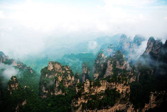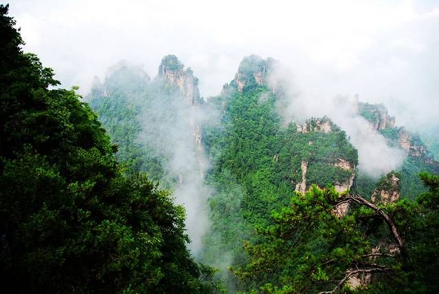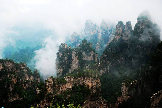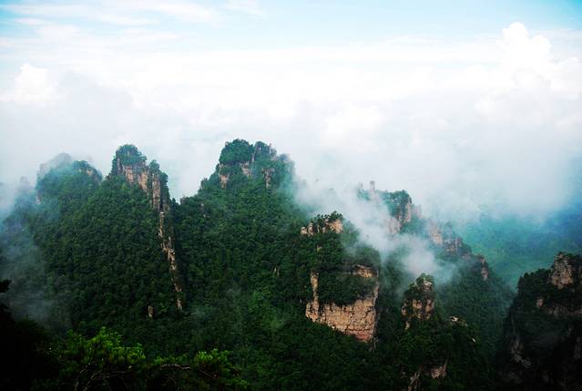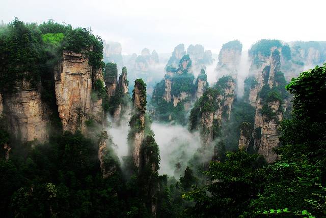 袁家界本身就峰林耸立,景色极美,再加上雨后初晴,轻云淡雾于群峰间飘浮、缭绕,山移峰潜,好似琼楼玉阁,时隐时现。