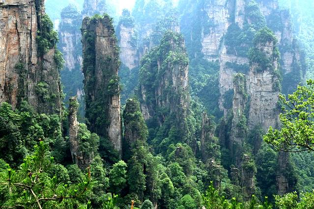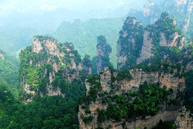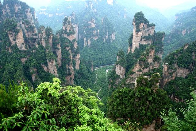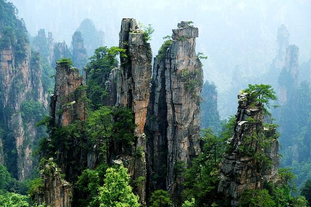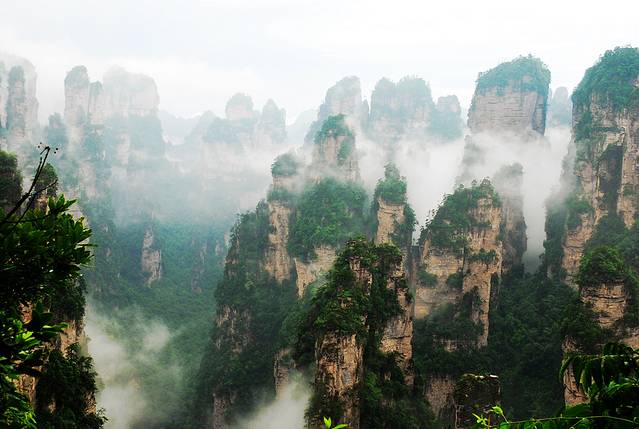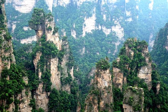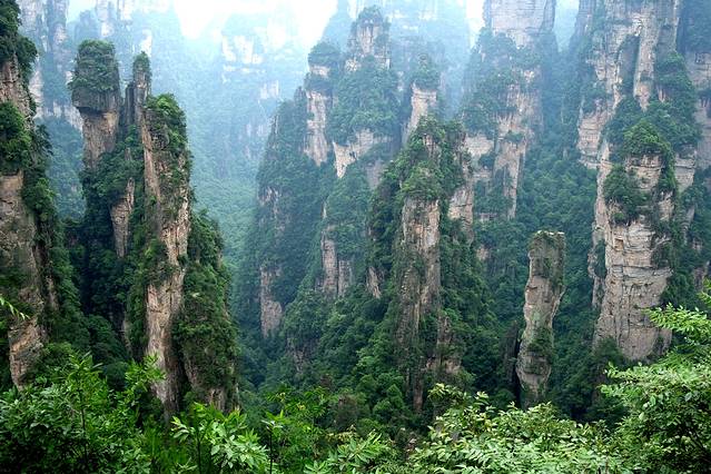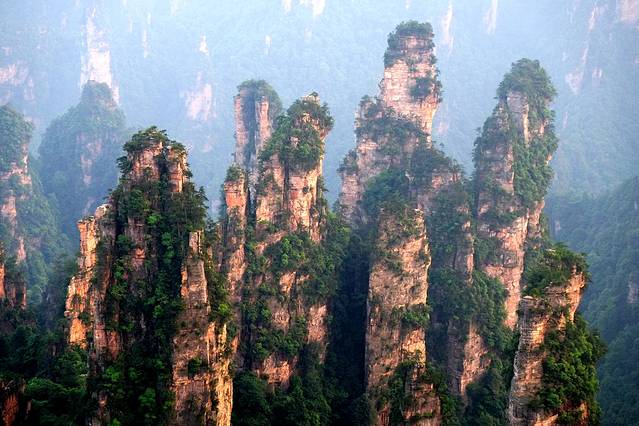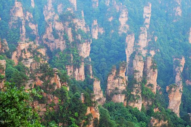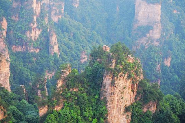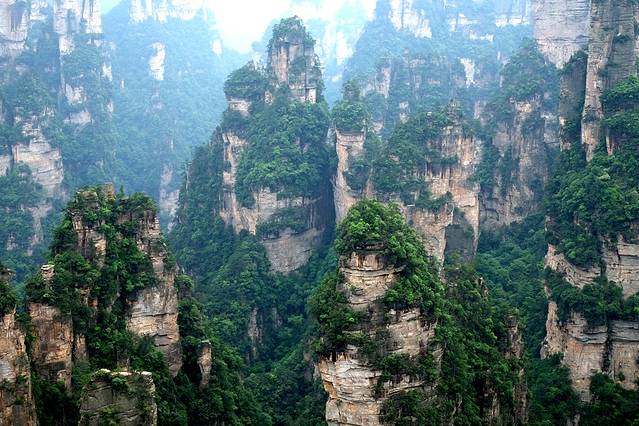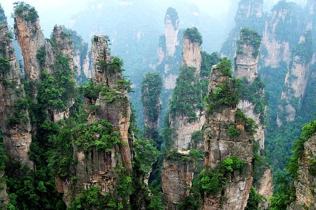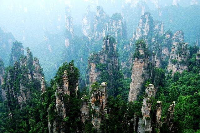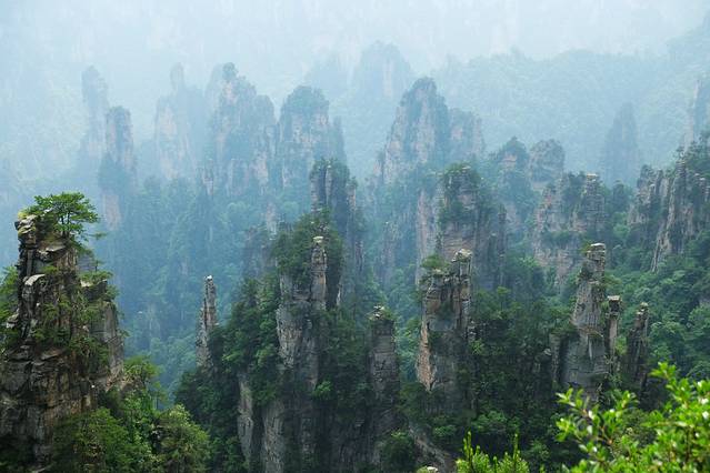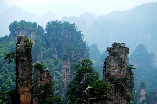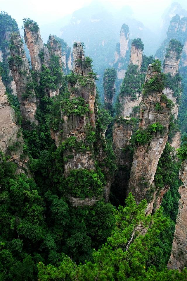 袁家界本身就峰林耸立,景色极美,再加上雨后初晴,轻云淡雾于群峰间飘浮、缭绕,山移峰潜,好似琼楼玉阁,时隐时现。