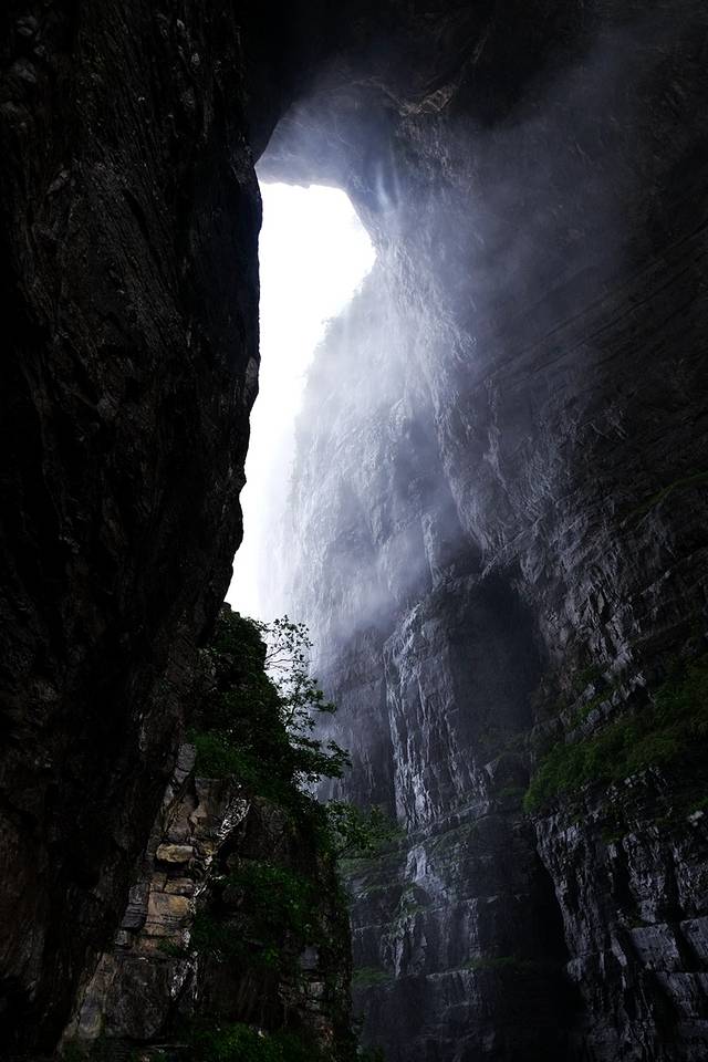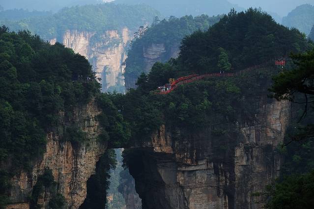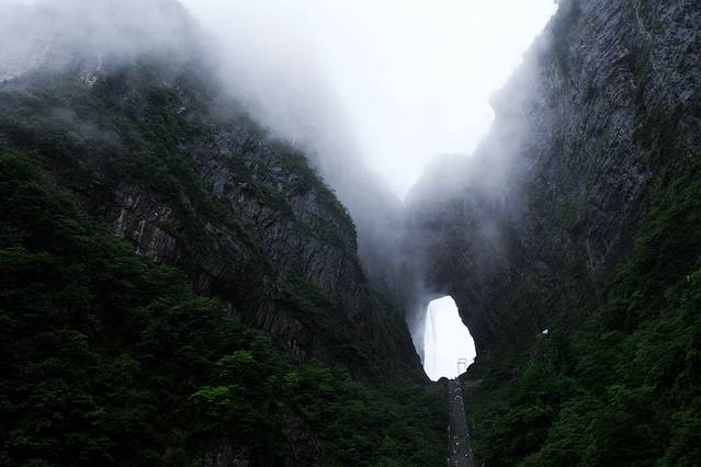 坐着首尾相连,仿佛慢无止境的穿山电梯,从隧道一路向下,来到半山腰,天门洞开的奇景赫然出现在眼前。