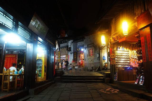 已经过了十二点,凤凰古城里面的主要街道上还是灯火通明的。