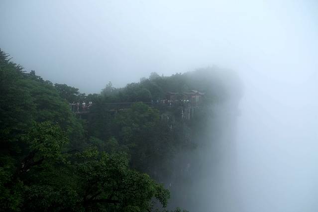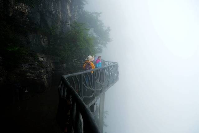 天门山上的鬼谷栈道,悬于鬼谷洞上侧的峭壁,如果能看见下面,走起来景色优美又胆战心惊,雾天虽然仿佛仙境,但也失去了很多趣味。