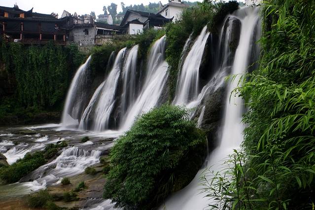 芙蓉镇三面环水,最独特就是这个大瀑布穿镇而过,让这里显得别有洞天。也正是因此,芙蓉镇被称为是“挂在瀑布上的千年古镇”。这是湘西最大最壮观的一道瀑布,分两级从悬崖上倾泻而下,声势浩大,水大的时候方圆十里都能听见瀑布的轰鸣。