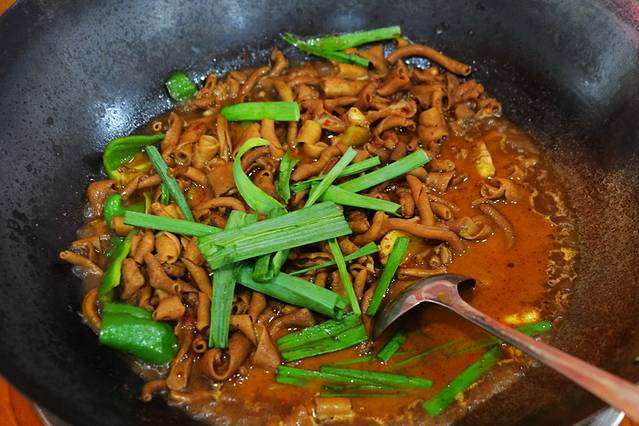 钱粮湖土鸭馆在张家界很火,鸭肠锅很不错,带点鸭油,鸭肠子摊在锅底面上,黄橙橙的一片,那么多条条根根,看上有色有型。这锅也是土土的原生态大铁锅,看让去就让人很有品尝的欲望。据说和鸭肠锅和鸭肉锅合在一起吃的味道才是钱粮湖土鸭的真正味道,人多的话可以尝试。这一大锅48元,我们三个人吃都足够了。