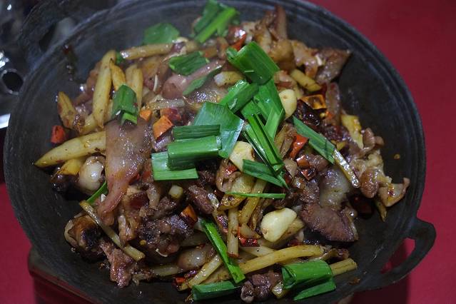 张家界街上可以看到到处都是三下锅。所谓的三下锅其实就是一种很方便的干锅,它是由三种主料做成的炖着不放汤的火锅。推荐干煸肠子、干煸核桃肉和湘西腊肉三种混在一起炖,吃的同时还可以点一份酸萝卜,又脆又酸。