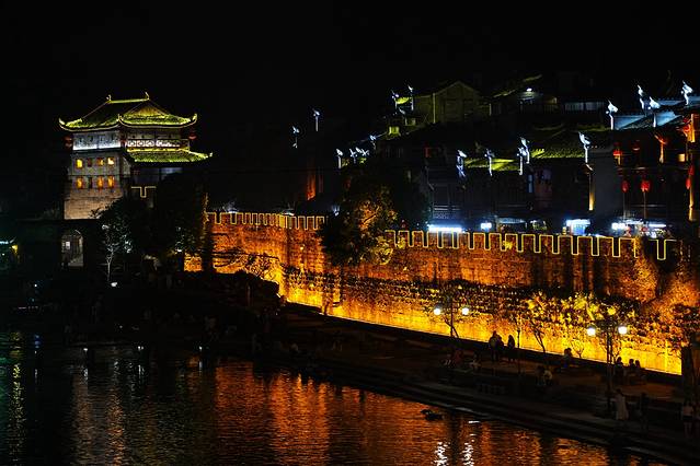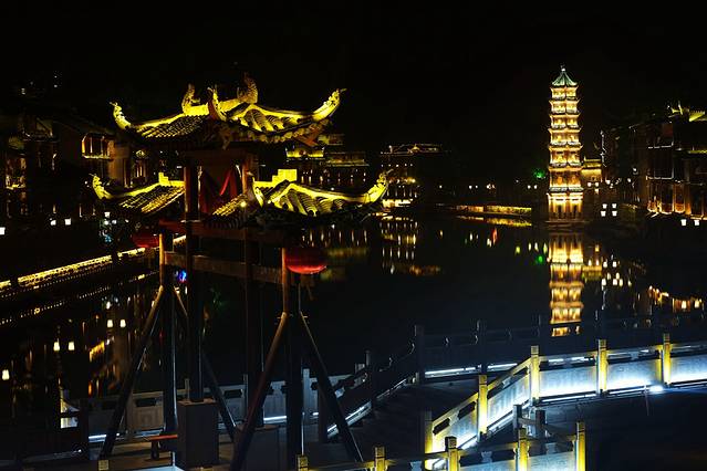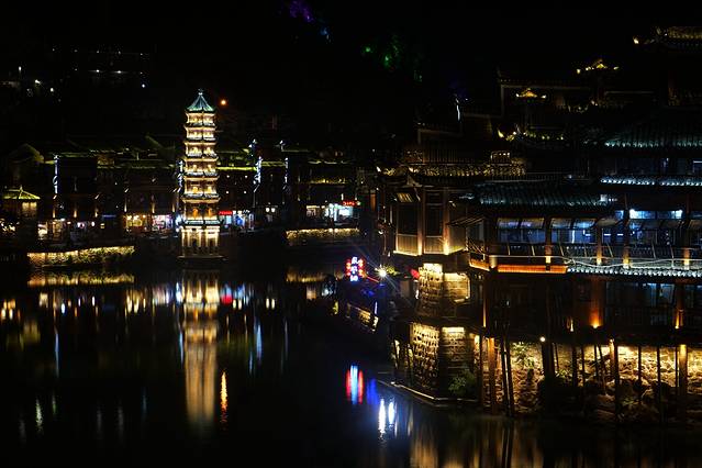 凤凰的这座沱江北岸的万名塔也很有名,白天看不起眼,晚上在灯光的装扮下精致秀丽,宛若少女婷婷玉立在沱江之畔。