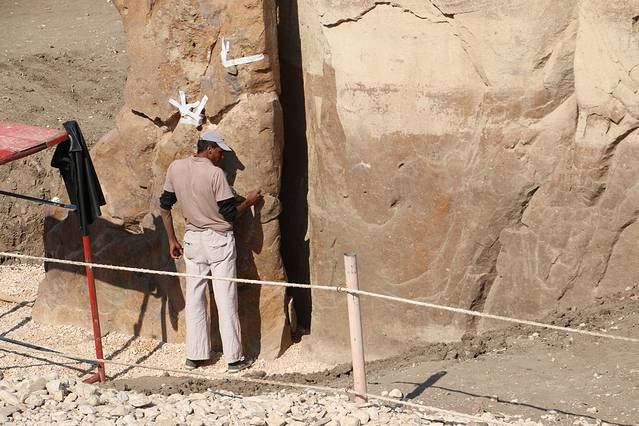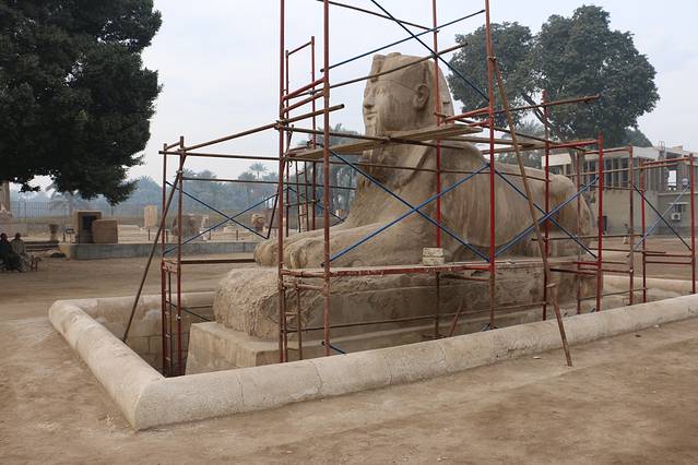 维修中的阿蒙霍特普二世雪花膏石人面狮身像,长8米,重达8吨。
