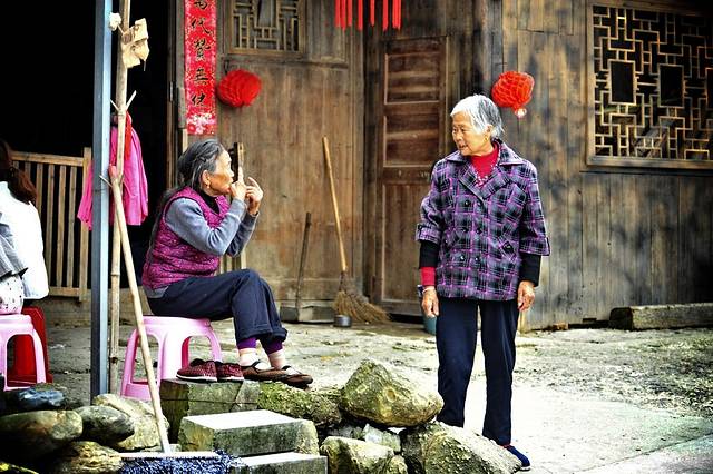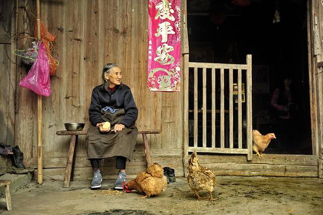 村子里多见老人,他们在一起唠嗑,做家务。年轻人现如今在这样的山村里是待不住的,外面的世界太精彩,都出去打工去了。
