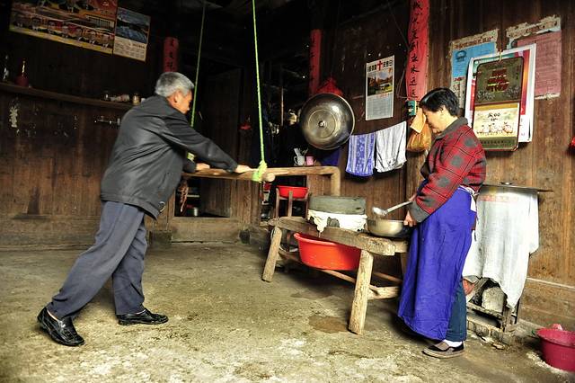 一户人家门口,我们遇见了正在做豆腐的老两口。