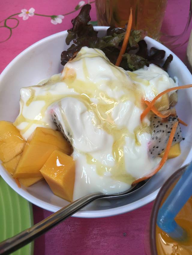 美好的一天继续从早餐开始,酒店的泰式粥,感觉很像米糠,配了一个颗煎蛋,咸咸的味道,加一点辣椒更好吃,酸奶水果沙拉也很赞