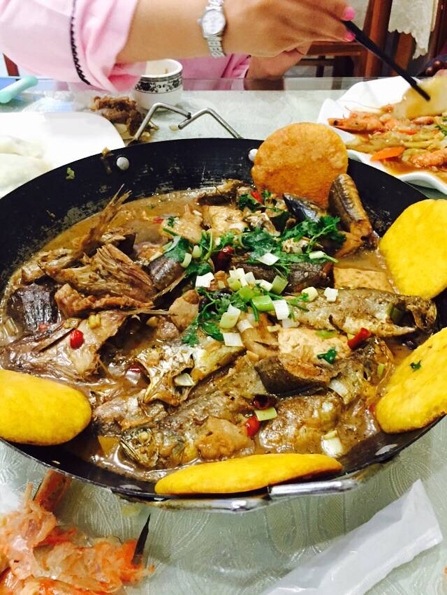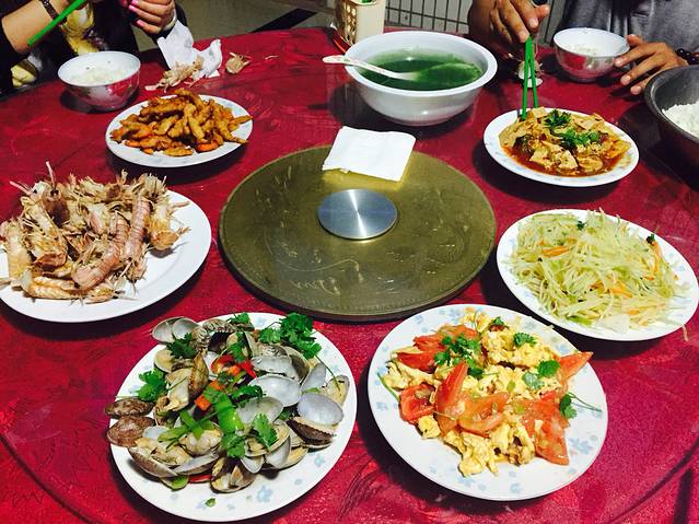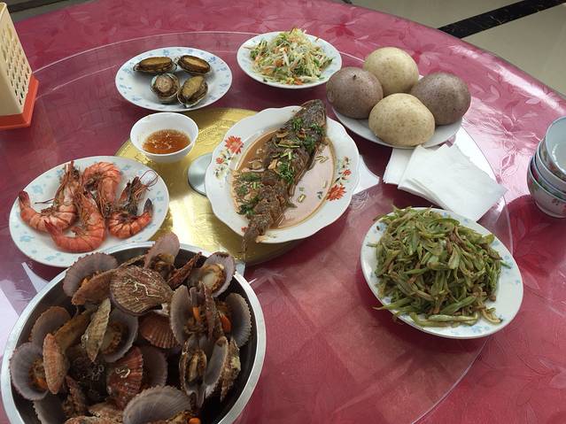 准备只参观月牙湾和九丈涯,一早天公不作美,一直下着小雨,我们打着伞出发了,没有包渔家院的车,因为他说两个景点收我们100,最后打车我们也只花了65.虽然岛上不太好打车。到了景点,小雨一直就没停过,很扫兴,九丈涯连一半都没游览完就原路返回了,因为带着孩子,鞋都湿透了。中午拿完行李想着到蓬莱吃午饭,到了码头发现对面就有小饭馆,就随便点了三个菜,凑合吃了赶紧上船了。船上定好了蓬莱的酒店,到快捷酒店都三点了,我们还是先睡午觉,睡醒了6点多走不远有个抹直口什么什么饭店,鲅鱼馅饺子6块一个,一盘4个,我们没吃了