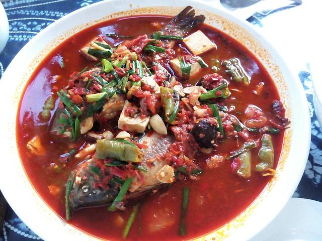 【私房梅子雨】洱海鲫鱼,西红柿,泡椒,韭菜,豆腐,梅子,貌似还有酸萝卜。。酸辣口味,个人超级喜欢。我本身胃不是很好,但还是用勺子舀菜汤伴着米饭吃,豆腐很嫩,鱼挺好吃的就是刺有点多有点硬,谁让它是鲫鱼呢,就是这个特点。总体还是很棒的