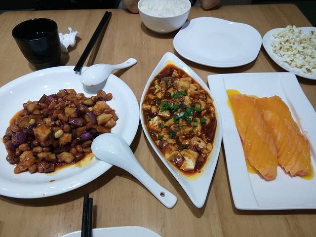 故地重游,主要是因为背包太沉,天气炎热想找个地方休息休息填饱肚子。接近十一点钟到店,没开张,还在进行员工培训。坐在旁边看着感觉还蛮不错,有点小期待。点了三道菜,上完菜就瞬间爆炸,从左至右分别是茄爆鸡丁、麻婆豆腐、养颜木瓜