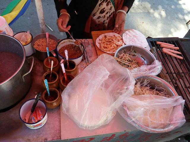 烤饵块,和家里的春饼差不多。饼是现烤制,豆芽、萝卜丝、肉末等提前备好,酱料分咸甜两种,3元一个,很香