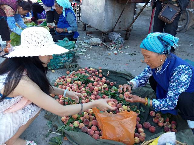和白族的大妈一起挑拣桃子,3元一斤的