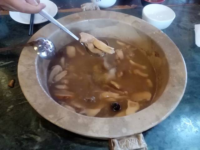这个团购套餐是168,价格有点小贵咯,市场上的新鲜松茸才80块钱一斤哦。五盘野生菌,四分之一土鸡,蘸料加两种蔬菜,一桶米饭。两个人吃不完。