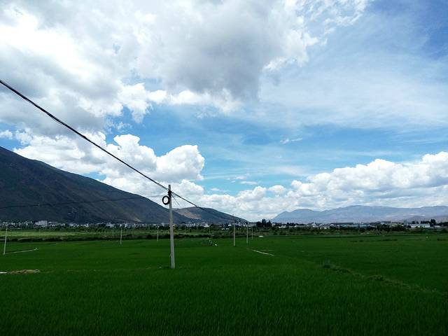 算是正式旅行的第一天吧,一觉睡到自然醒。八点多起来,抹上防晒霜戴着帽子骑车出门,到才村早市觅食。从客栈出来,骑车大概20min左右就到了。沿途两边是绿油油的水稻,身后是苍山和白云,特别美,适合拍照,但是注意来往车辆较多,安全第一。